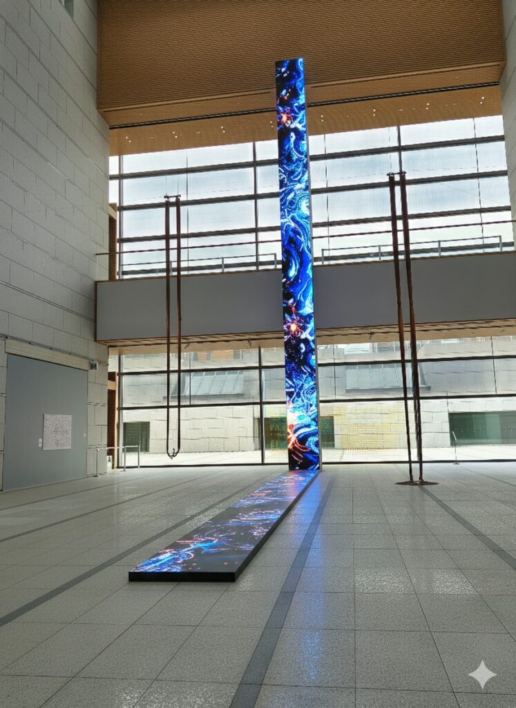 巨大な光の柱が、無機質な空間を情報の液体に変える。数値でしかないデータが「物語」として立ち上がる瞬間です。