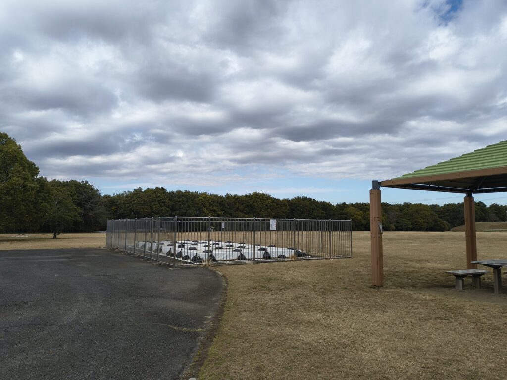 地上の多目的広場にある「重機投入口」。ここからクレーンでブルドーザーを吊り下げて地下へ送り込むとのこと。