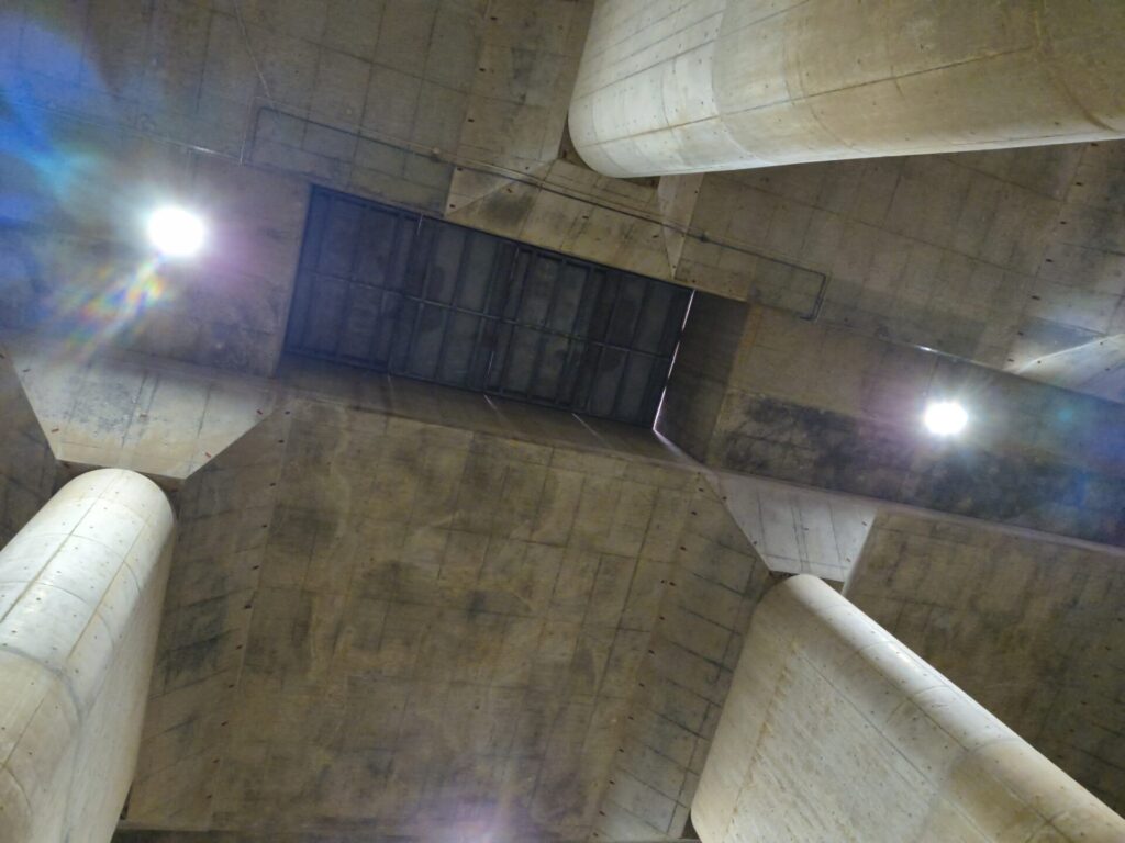 地下神殿から見上げた様子。巨大な天井に開いた開口部から重機が降りてくる光景を想像すると、維持管理とは言え、スケールの大きさに圧倒されます。