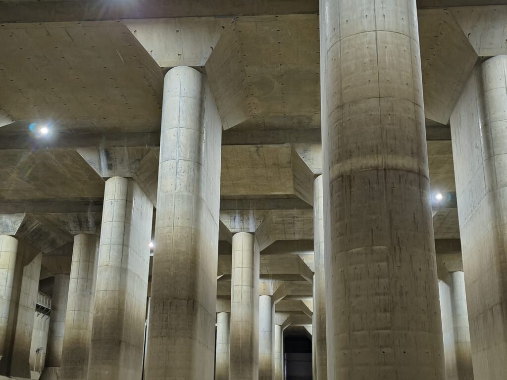 調圧水槽にそびえる59本の巨大柱は、1本あたり500トン。10個のコンクリートブロックが整然と積み上げられたその姿は、まさに現代の知性が生んだ神殿です。